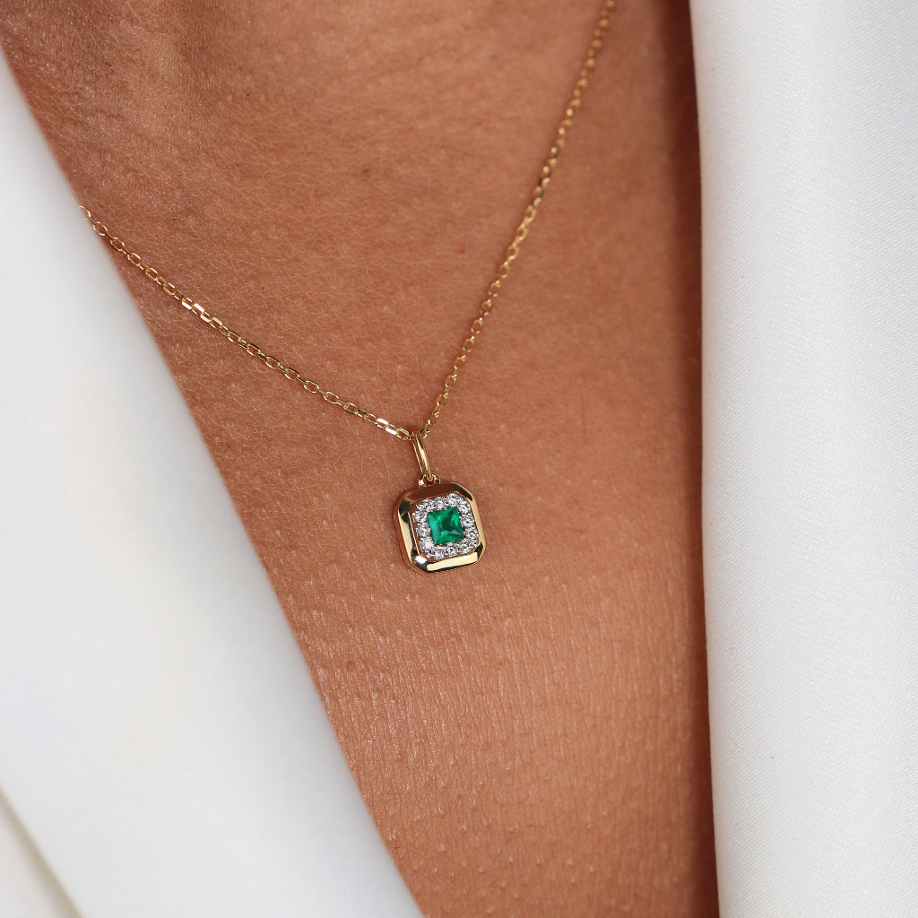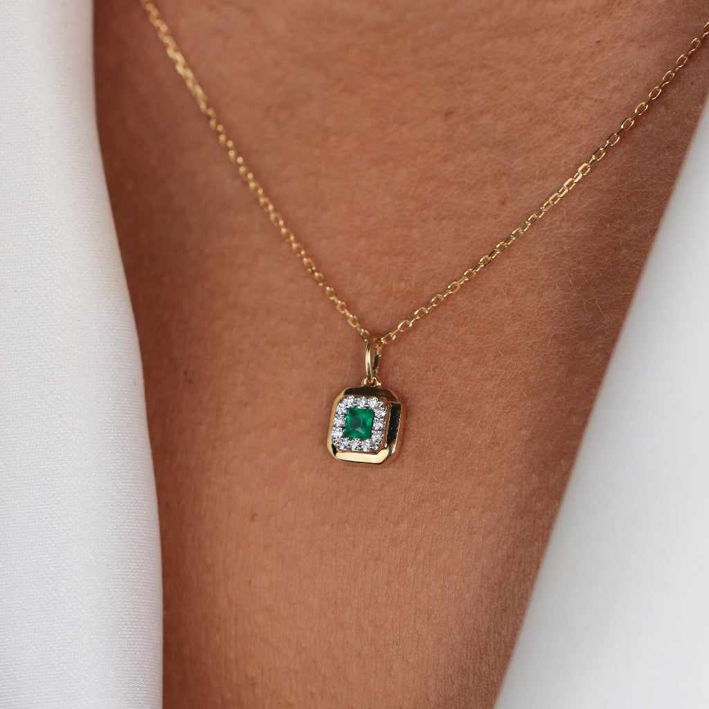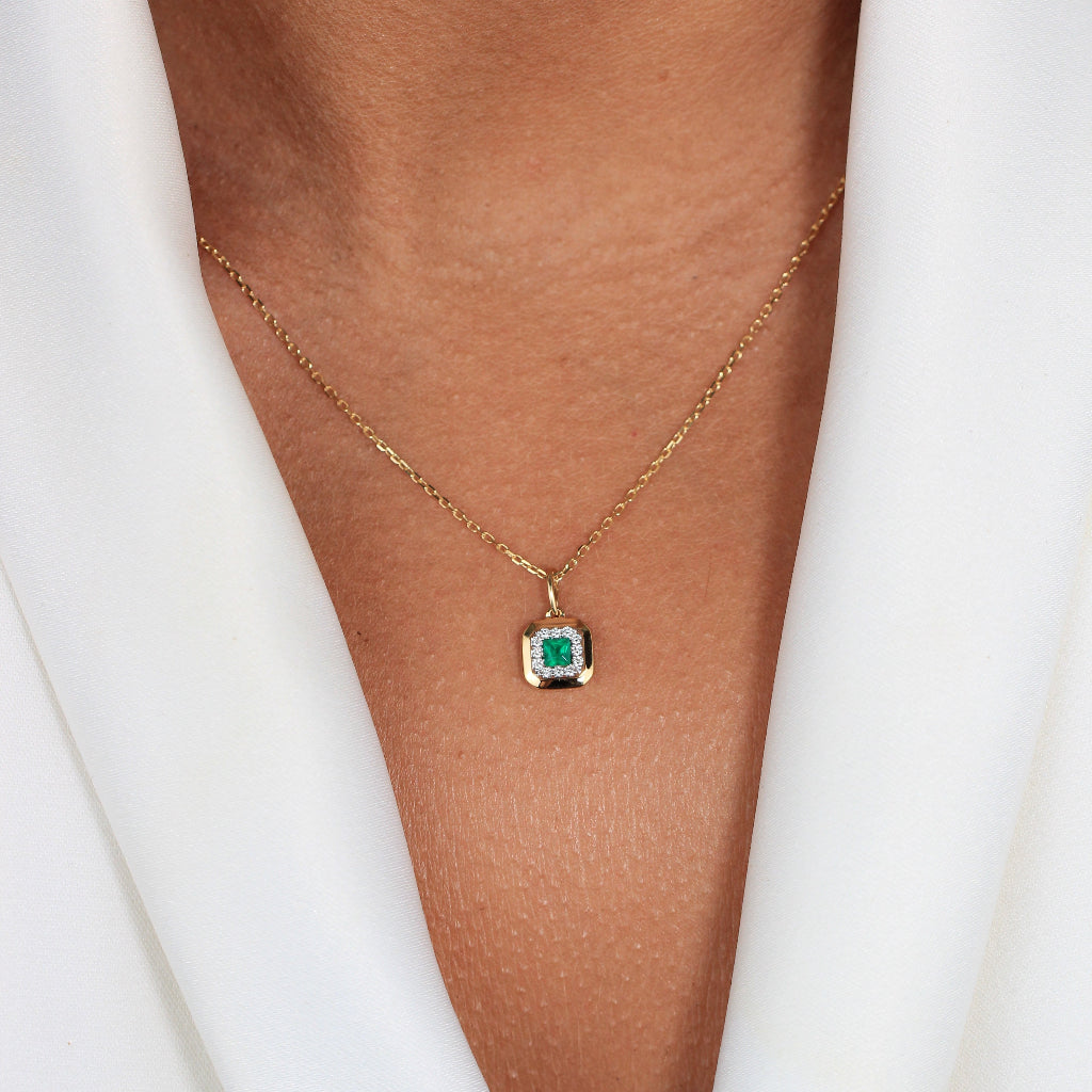 Collar realizado en oro amarillo de 18 quilates con un colgante con una esmeralda central talla princesa de 0,13cts. y una orla de 12 diamantes de 0,06cts. El colgante mide 7,5mm de ancho.