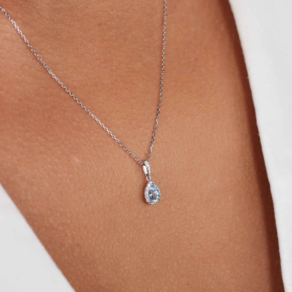 Collar realizado en oro blanco de 18 quilates con una aguamarina central talla pera de 0,375cts y 21 diamantes en la reasa y alrededor de la piedra. Los diamantes tienen un total de 0,12cts. El colgante mide 1,5cm.
