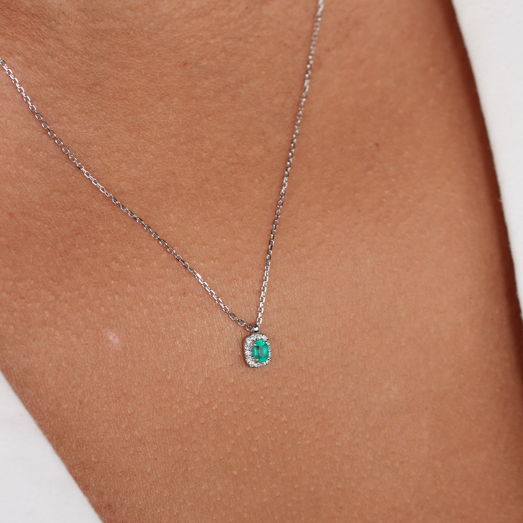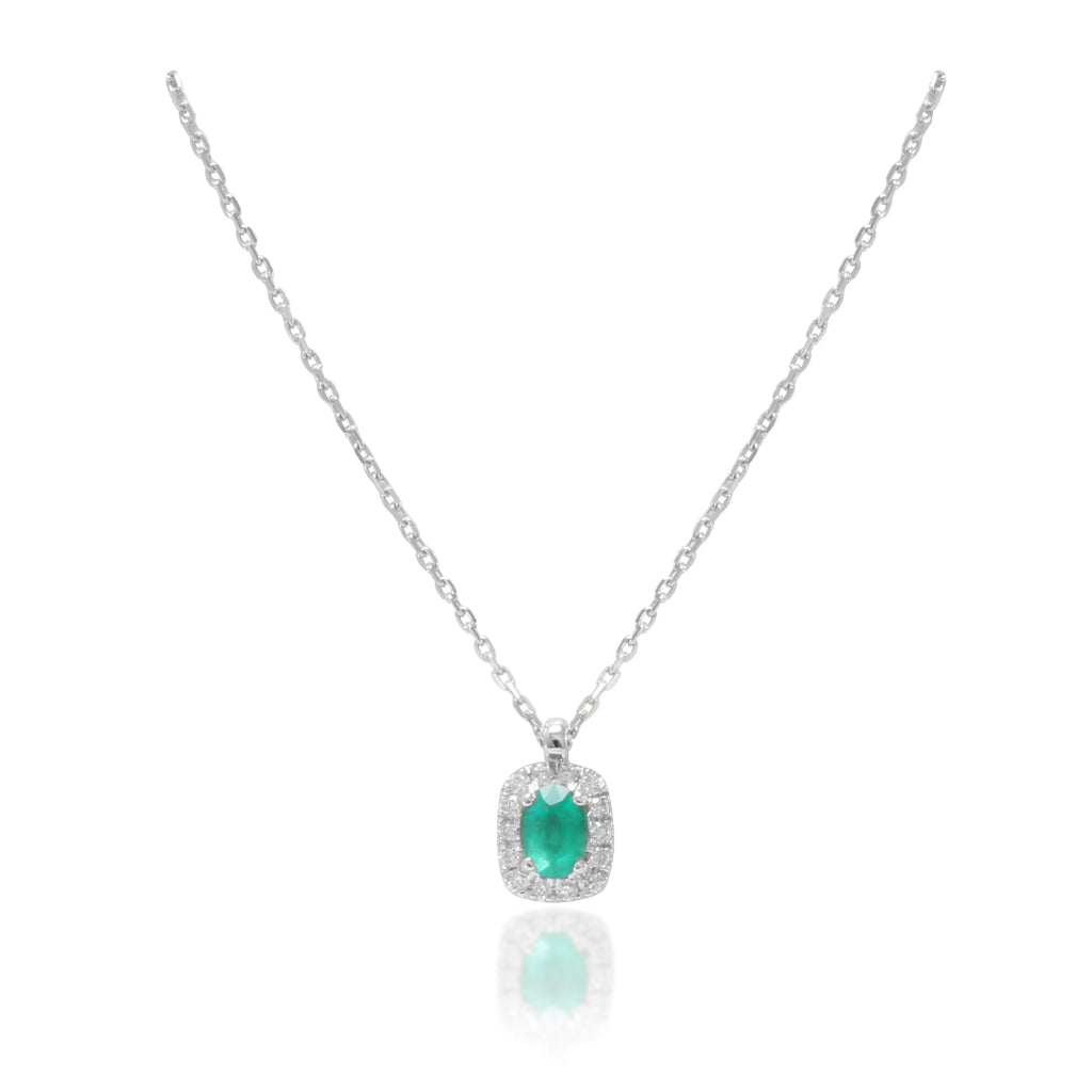 Collar realizado en oro blanco de 18 quilates con una esmeralda talla oval de 0,15cts y una orla de 14 diamantes con un total de 0,09cts. El colgante mide 0,7mm de alto con la reasa.
