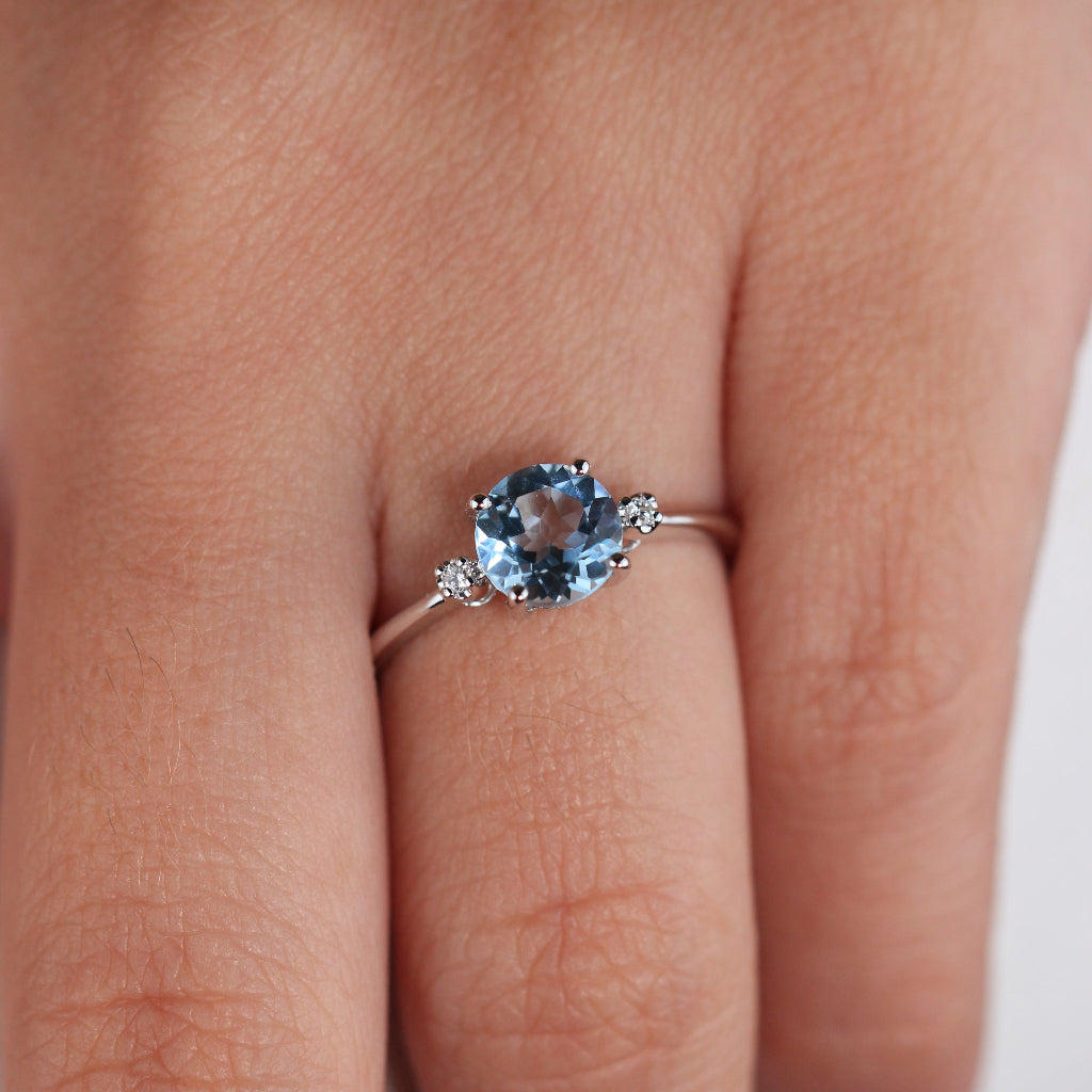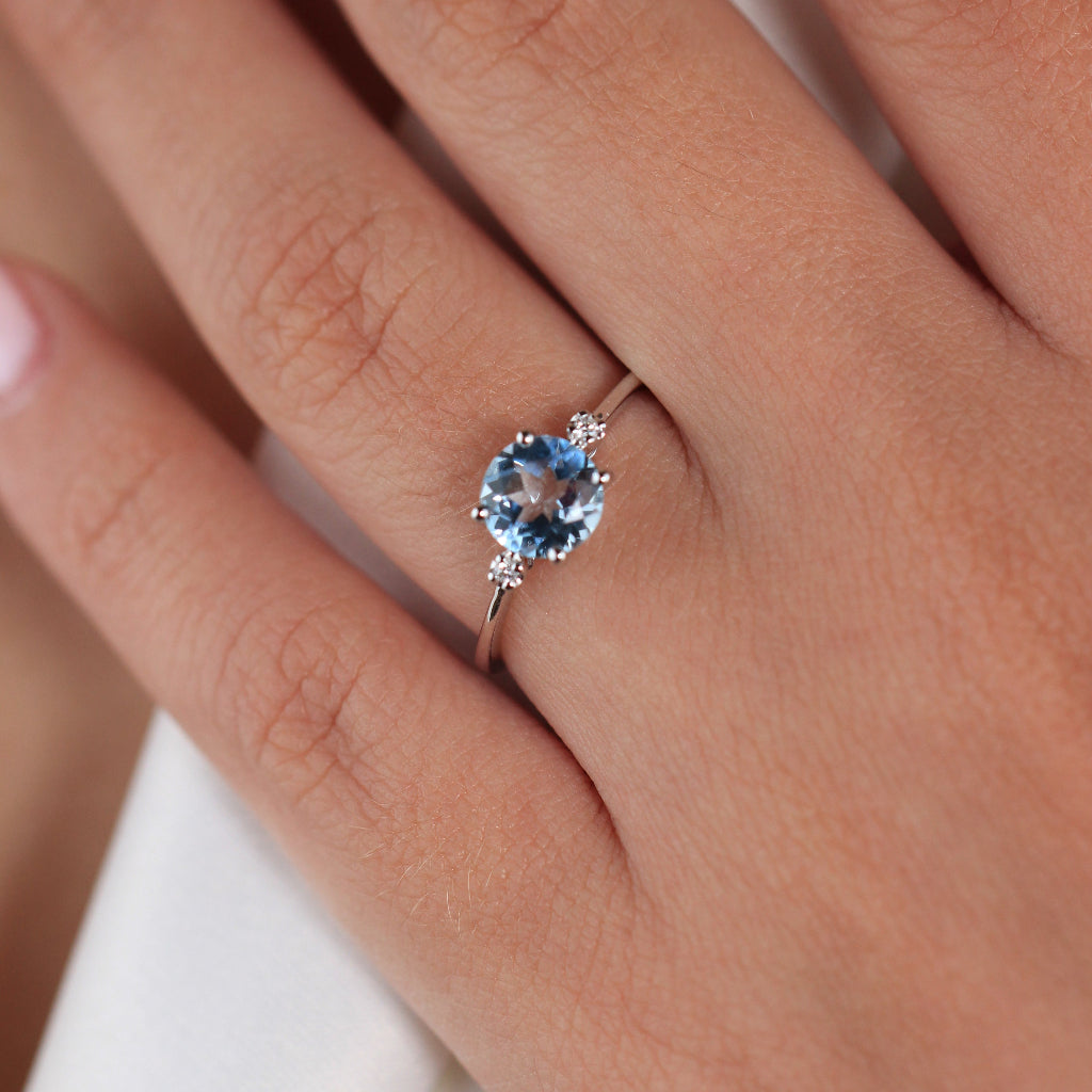 Sortija realizada en oro blanco de 18 quilates con un topacio azul de 0,97cts. y dos diamantes a los laterales de 0,019cts. El motivo principal mide 6,5mm.