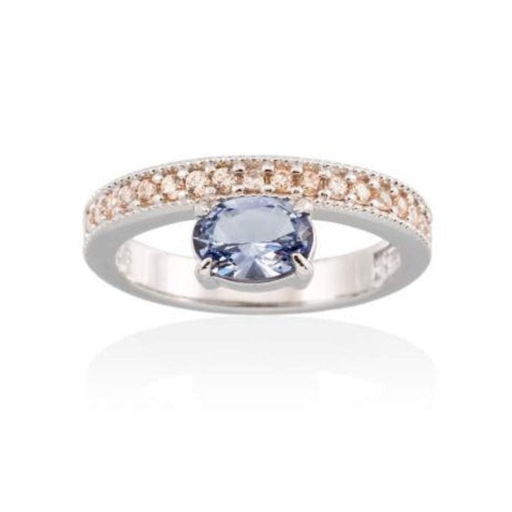 Rhodium plated 925 sterling silver ring, cognac zirconia and blue synthetic stone.