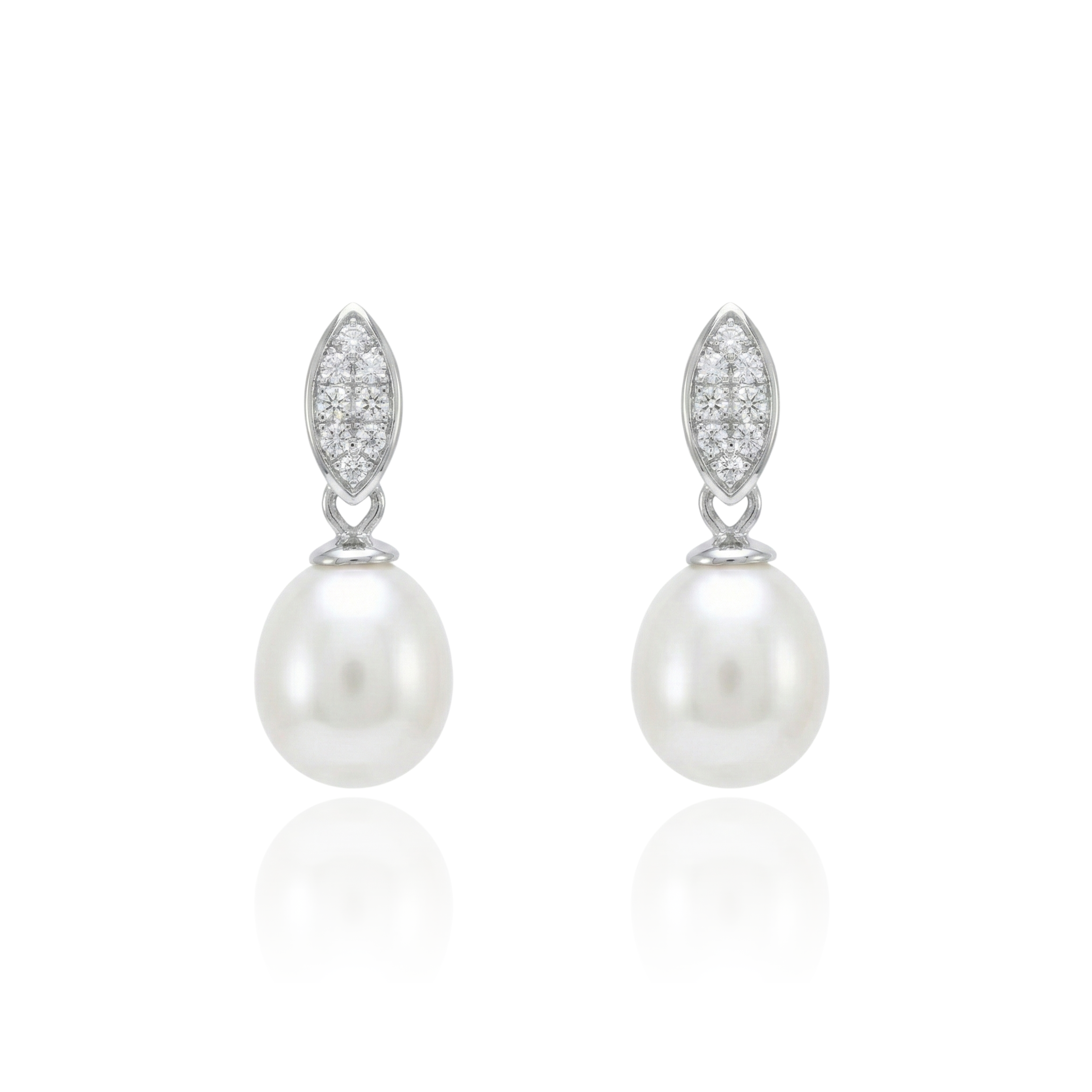 Pendientes realizados en plata de primera ley con un motivo en forma de marquise con circonitas y un colgante de perla cultivada.