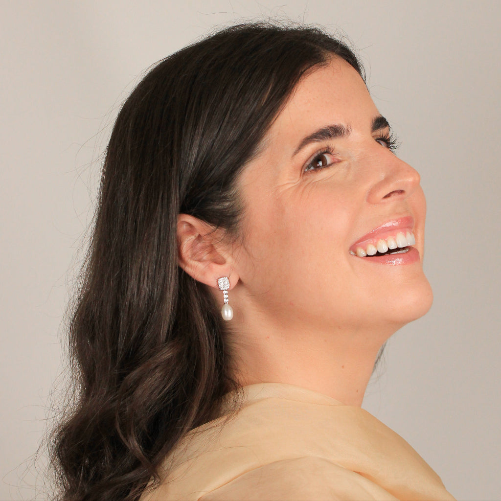 Pendientes realizados en plata de primera ley con un motivo cuadrado y una caída de tres chatones con circonitas incoloras.