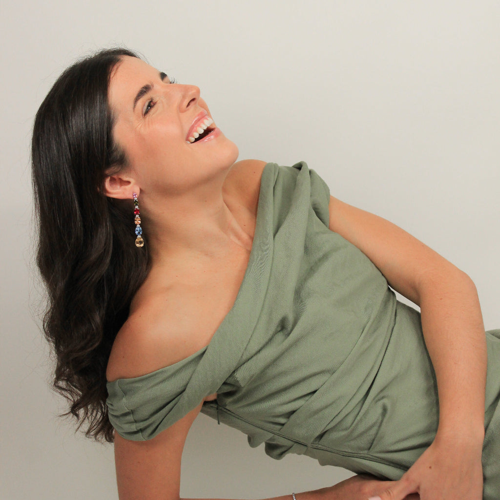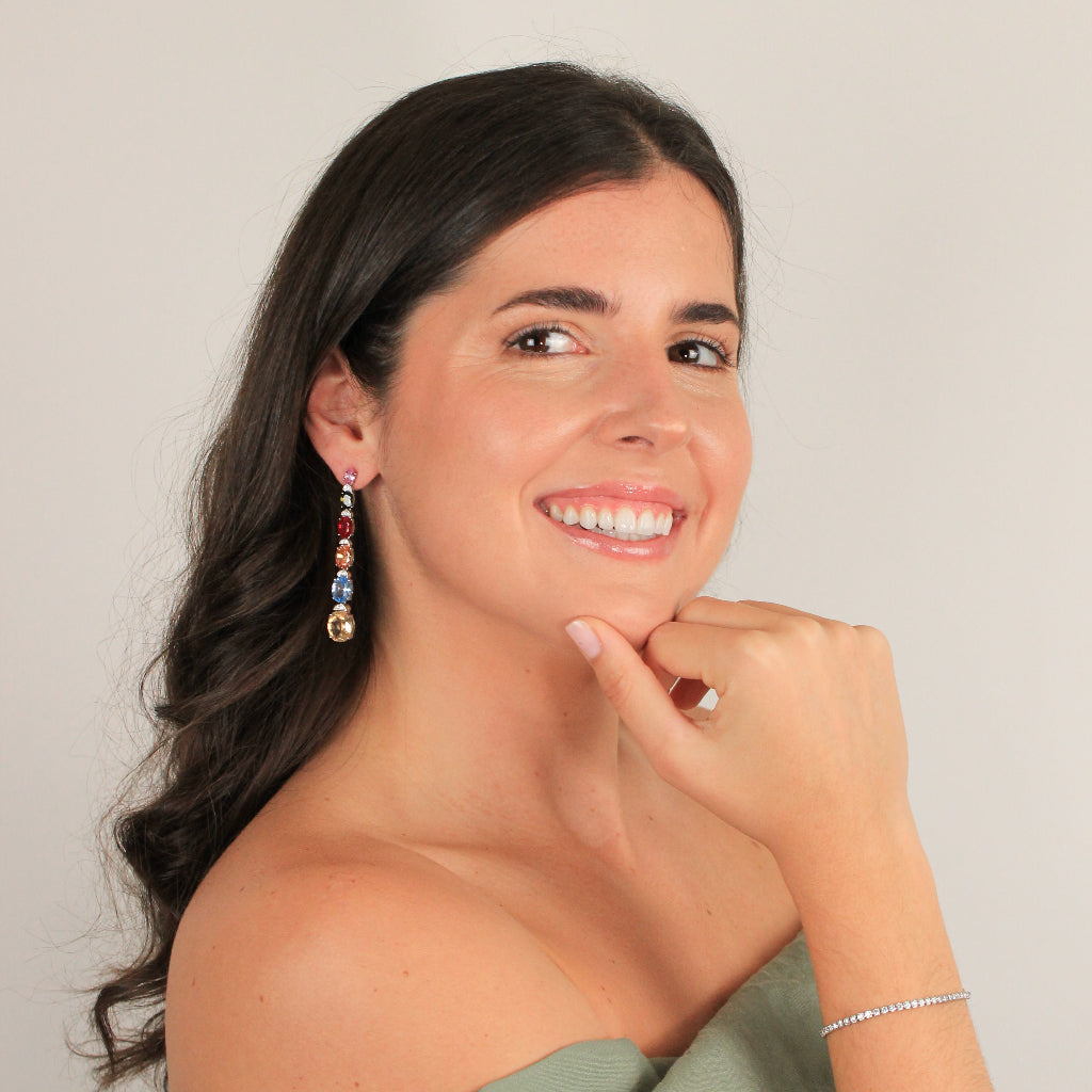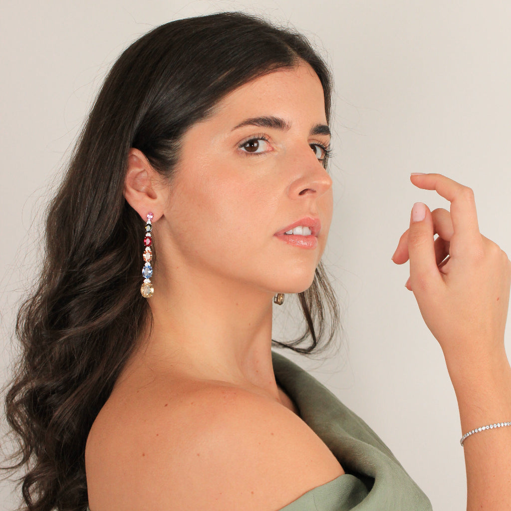 Pendientes largos realizados en plata de primera ley con una caída de circonitas de colores. Los pendientes miden 6,5cm de largo.