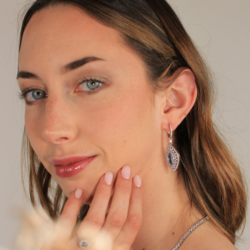 Earrings made of sterling silver with a central blue zirconia and colorless zirconias.