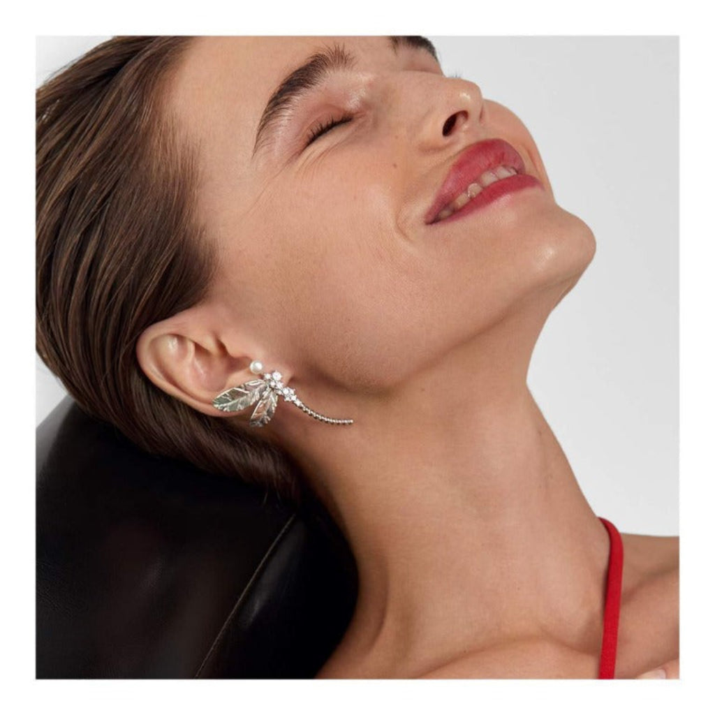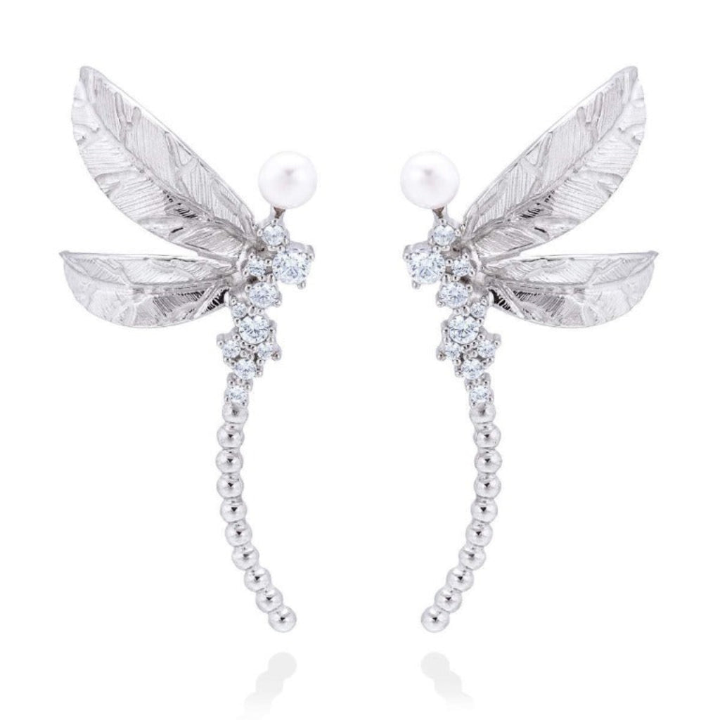 Sterling silver, zircons and cultured pearl earrings. Each dragonfly measures 5.4 x 2.6 cm.