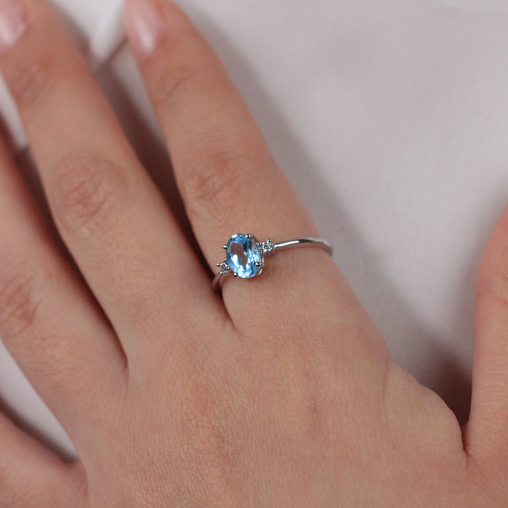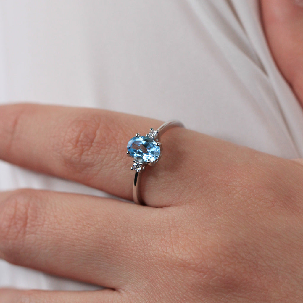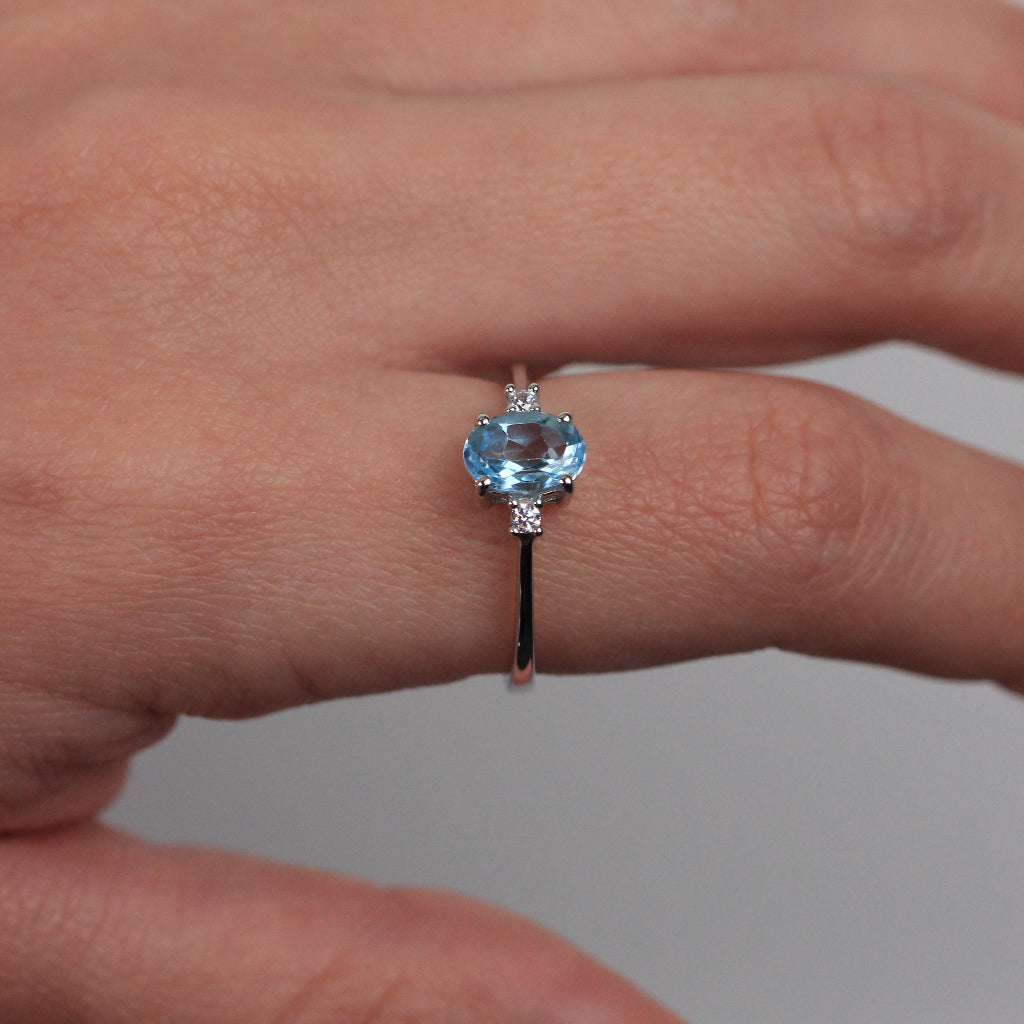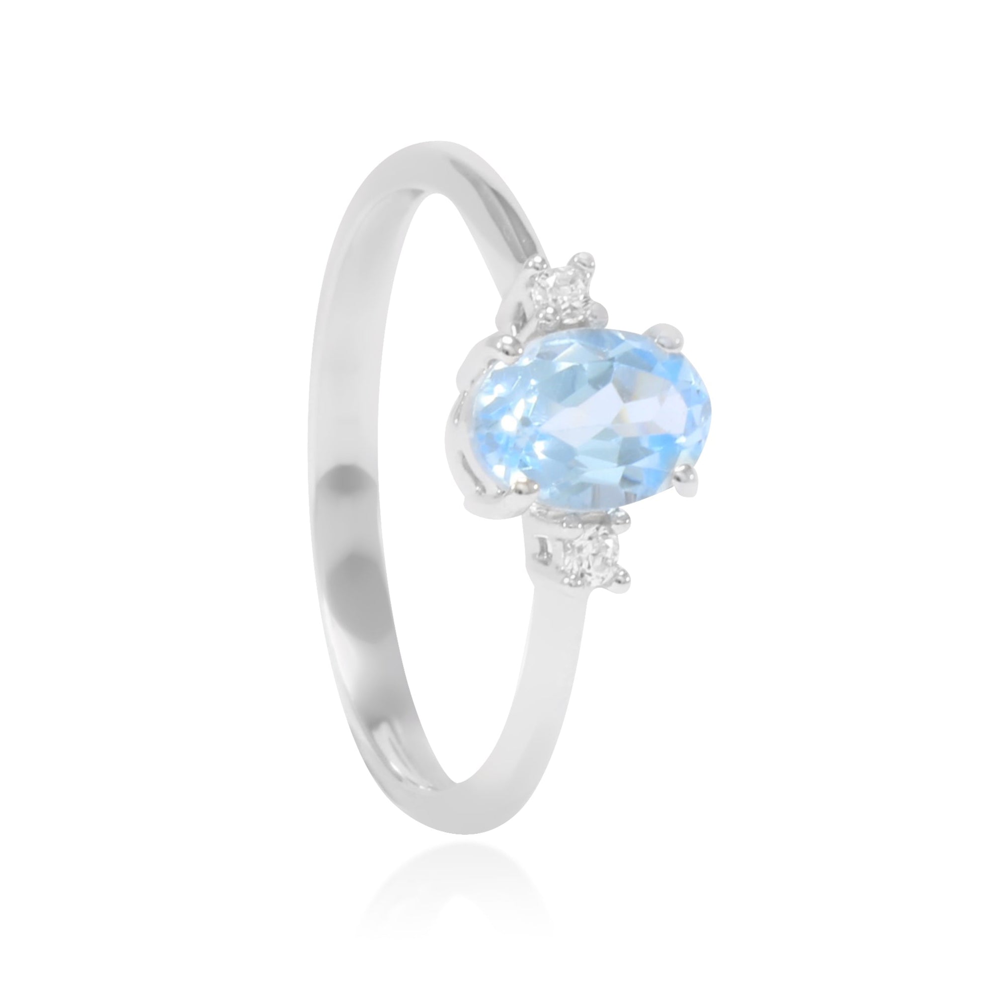 Ring made of 18-karat white gold with a central blue zircon and three colorless zircons on each side. The width of the aquamarine is 6mm.