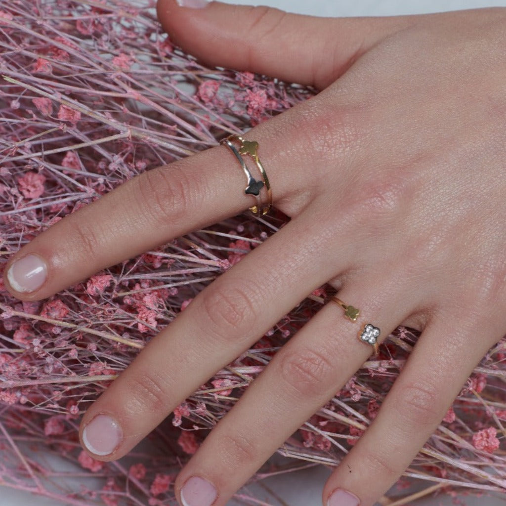 Sortija realizada en oro amarillo 18 quilates compuesta por dos tréboles de cuatro hojas uno cuajados de circonitas y el otro liso. El motivo principal tiene un ancho de 5mm.