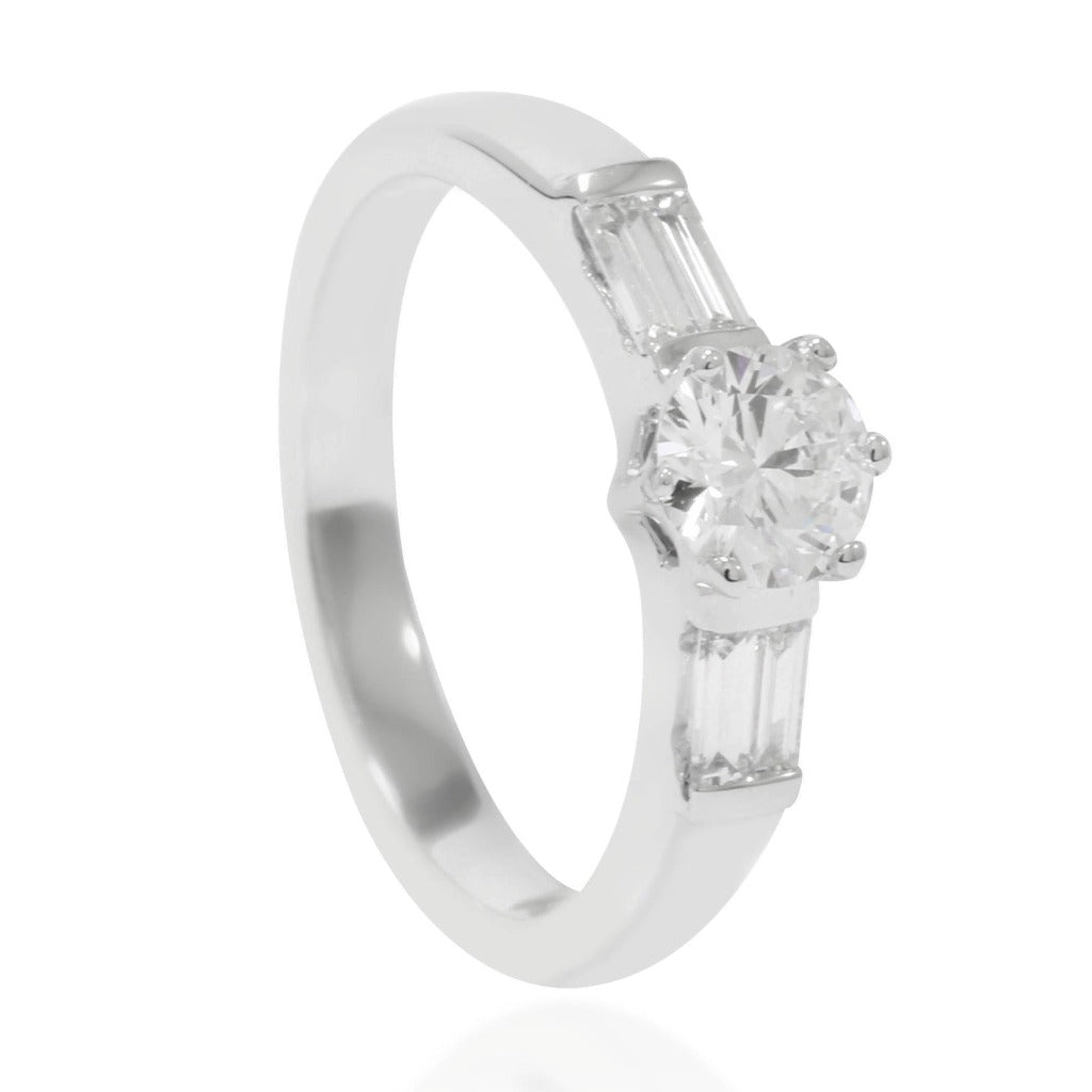 Sortija solitario en oro blanco de 18 quilates, 0,60 cts. de diamante natural talla brillante engarzado en seis garras y 2 diamantes naturales talla baguette engarzados en el brazo, peso total 0,27 cts. El motivo principal tiene un ancho de 5,7mm.