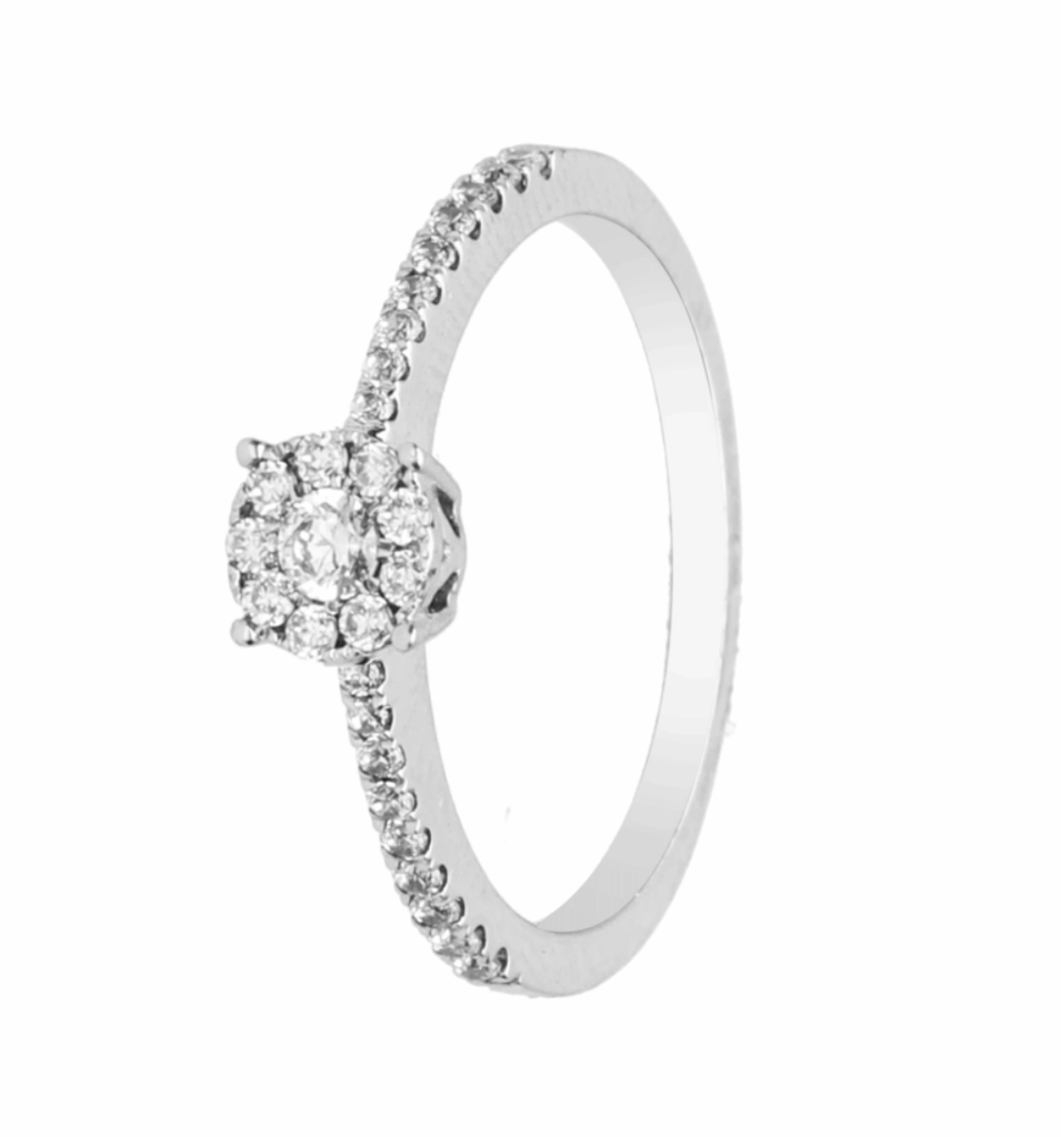 Sortija en oro blanco de 18 quilates con un diamante central rodeado de 9 diamantes y varios más distribuidos por el brazo. El peso total de los diamantes es de 0,26cts.