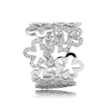 Sortija de oro blanco de 18 quilates compuesta por flores de cinco pétalos con tres flores cuajadas de diamantes talla brillante. Tiene un total de 71 diamantes talla brillante que pesa 0,52 cts. El ancho del motivo principal es de 1,8 cm.