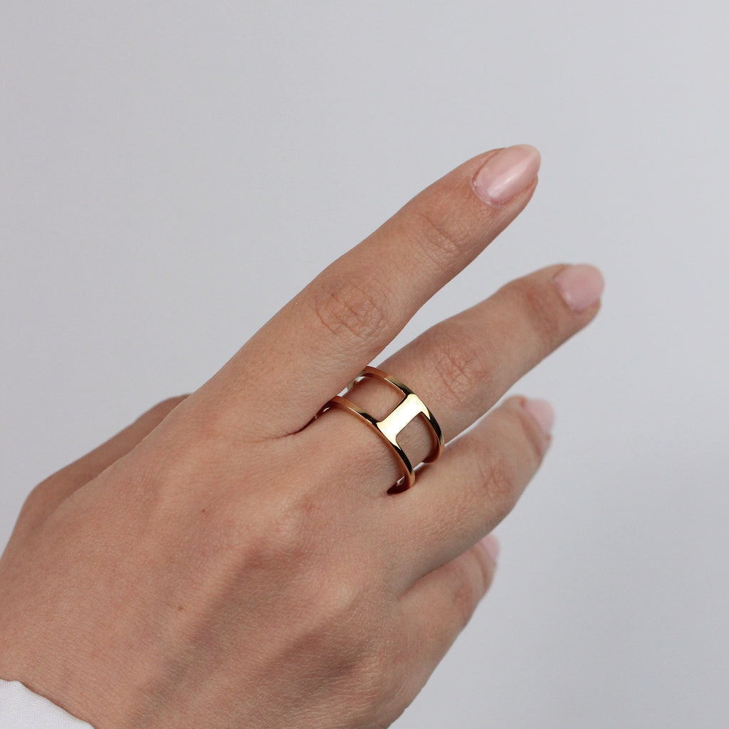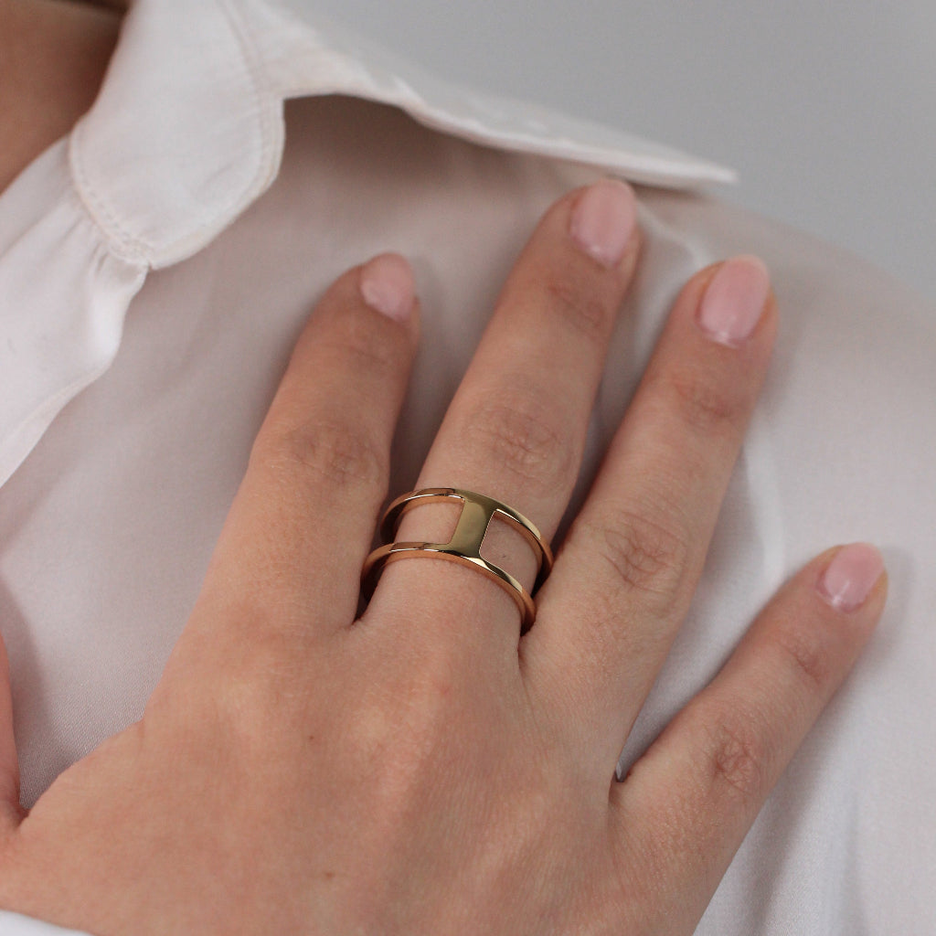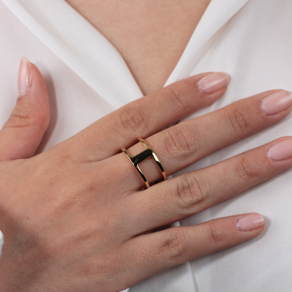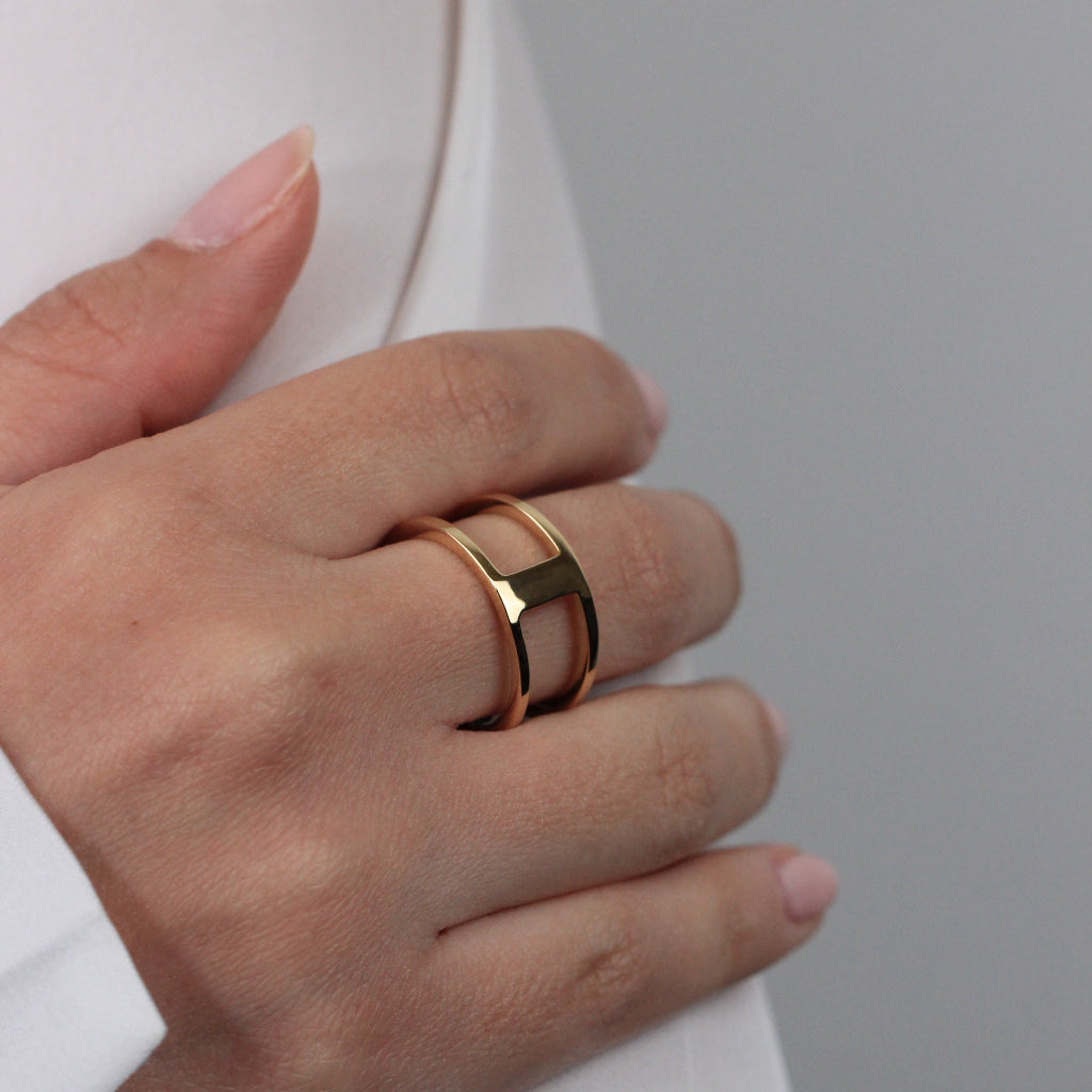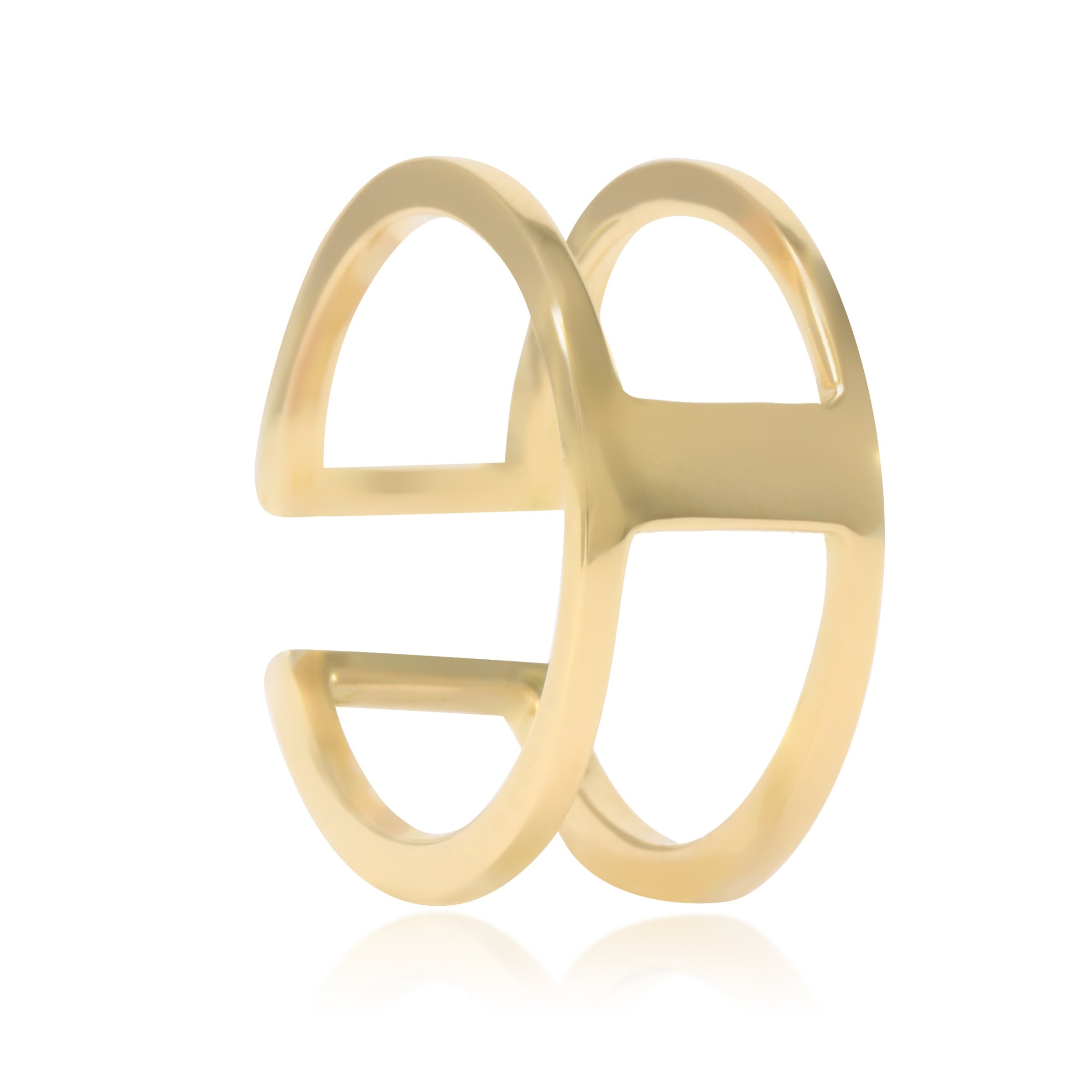 Sortija realizada en oro amarillo de 18 quilates con un diseño abierto. El ancho del anillo es de 0,9cm incluyendo los dos brazos y el espacio intermedio.
