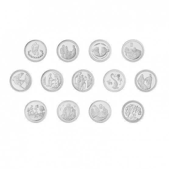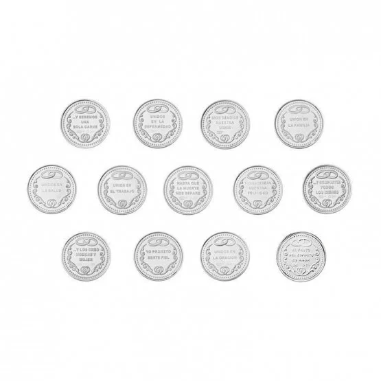 Arras para la boda realizadas en plata de primera ley con imágenes de pasajes bíblicos en el anverso y frases de la biblia relacionadas en el reverso. Incluye un precioso estuche para guardar las arras con una bandeja para llevarlas el día de la boda. Tienen un diámetro de 20mm.