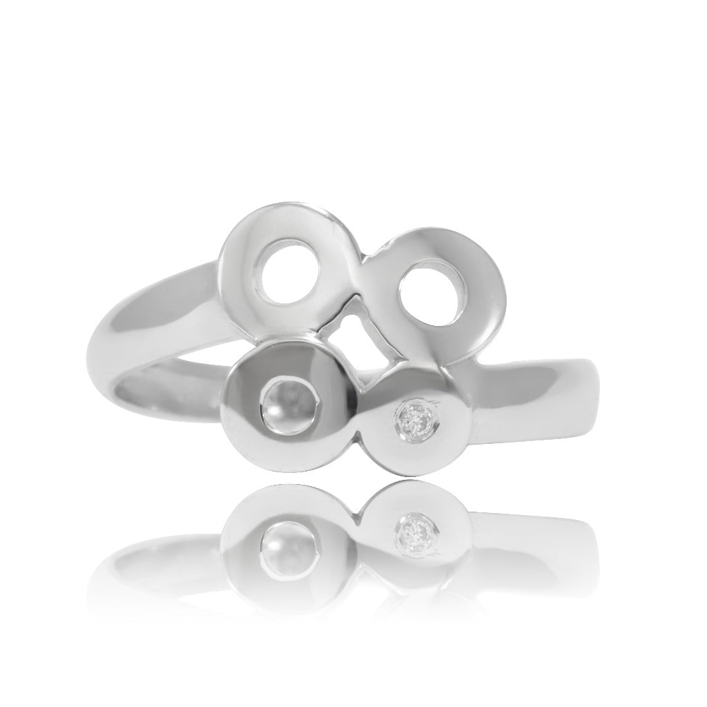 Sortija realizada en oro blanco de 18 quilates con cuatro círculos, uno de ellos con un diamante talla brillante en el centro. El ancho del motivo principal es de 9mm.